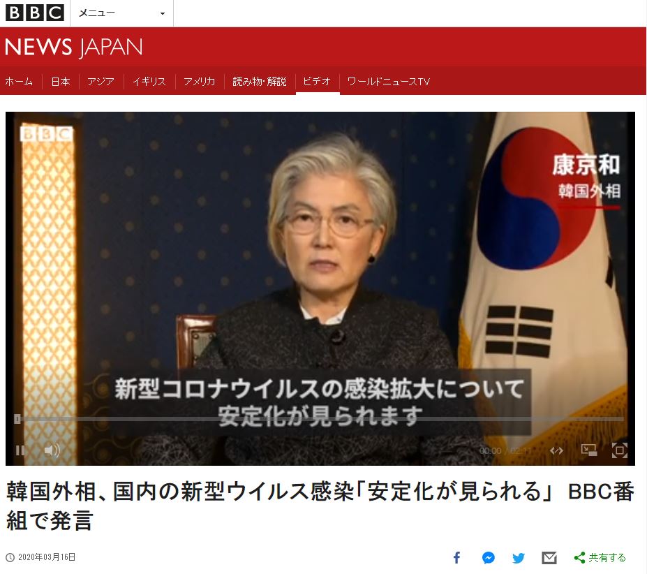韓国政府も、国際的に韓国モデルが注目されていることを受けて、同国の検査モデルが一定の効果を上げていることを英BBC向けにアピールした。韓国の康京和・外交部長官は感染確定数が減っていること、「証拠と科学にもとづき」行動していることを説明した。