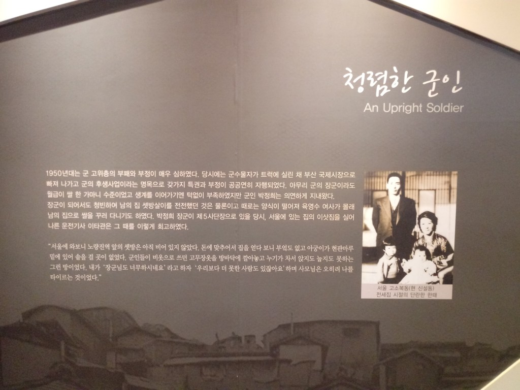 保守王国として知られる、この慶尚道では、朴将軍にシンパを感じる人が今でも多い。妻は大邱の出身だが、妻の母上は「あの人は立派な人、貧しかった韓国を取り合えず食えるようにしてくれた」と言っている。この生家の展示を見ると、実際貧しさから身を起こして国家発展のために生涯を捧げた立派な人に見えなくもない。だが、そんな精一杯好意的に見ようとする試みも一瞬で打ち砕かれる偏向展示が私を待ち受けていた。