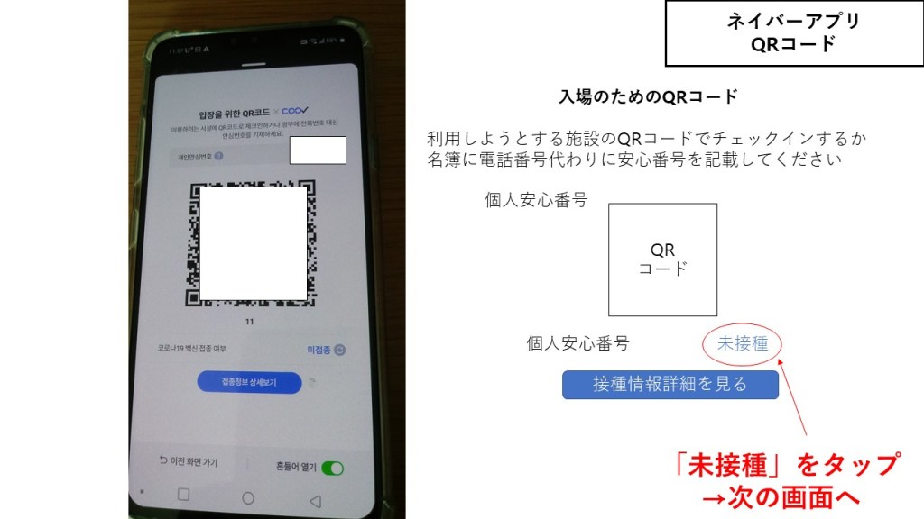 さて、これで僕のネイバーQRコード画面も「接種者」に更新されているはず。お馴染み、「ネイバーアプリをスマホを振ることでQRコード召喚の技」でQRコードを呼び出す。