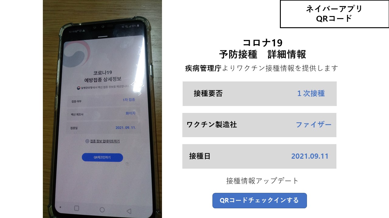 今日はコロナ予防接種(1次)を行ってきたので、その通知や接種証明画面等を日本語訳した。何かの参考にして頂ければ幸いである。 また、この記事は前回の『韓国コロナワクチン接種予約方法のまとめ』の続きでもあるので、前回記事もぜひ参考にして頂きたい。 まず、接種前日に以下のメッセージが携帯電話に来る。 というわけで外国人登録証を持参して近所の病院に行った。個人情報提供合意書、問診票、血圧測定、医師の内診を経て接種に向かう。 接種後10分は病院内で待機するよう言われ、また、以下のビラを渡され待機した。私は10時10分ごろに接種されたので、10時20分に帰宅するよう手書きのメモが右上に記されている。 ビラの内容はワクチン接種後の健康管理についてであった。 右半分も。 無事帰宅し、しばらくすると以下のメッセージがカカオトークに来た。 後半。 さて、これで僕のネイバーQRコード画面も「接種者」に更新されているはず。お馴染み、「ネイバーアプリをスマホを振ることでQRコード召喚の技」でQRコードを呼び出す。 (この技) まだ、「未接種」。でも心配ない、タップしてみると・・・ 接種記録が発給される。 今度こそ「1次接種」にアップデートされた。 さて!「接種情報詳細を見る」をタップすると、ついに以下の接種詳細が出る。 これで僕も晴れて1次接種者に認定された。めでたしめでたし。