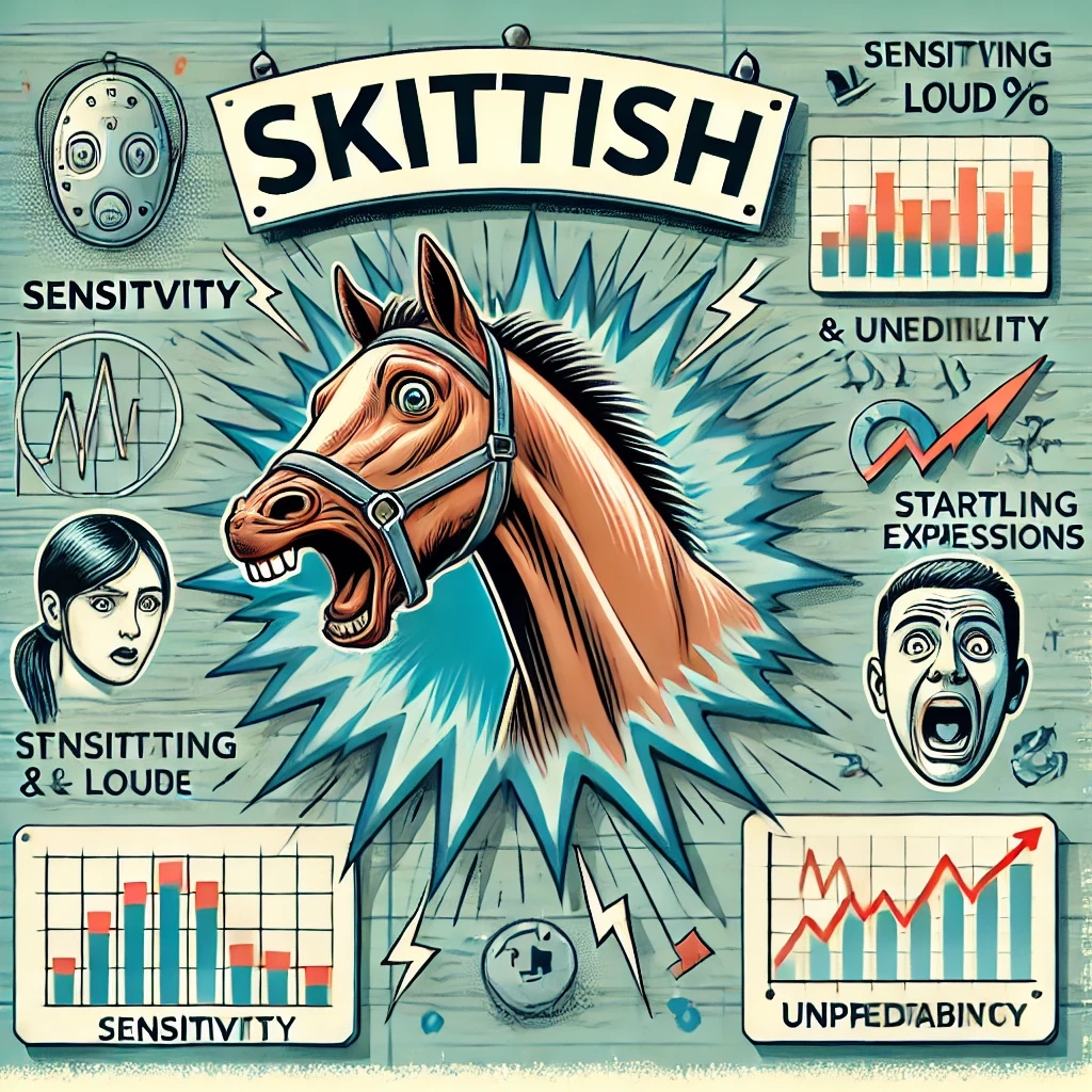 - 意味: 「skittish」は、「臆病な」「落ち着きのない」「敏感で警戒心が強い」という意味を持つ形容詞です。この単語は、特に動物(特に馬)や人が突然の動きや音に対して過剰に反応する様子を表すために使われます。また、状況や市場などが不安定で予測しにくいことを示す場合にも使われます。